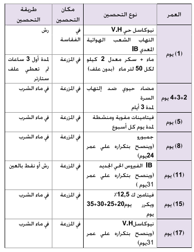 رابعا :برنامج التحصينات والعلاجات الوقائية من أمراض الصيصان اللاحم كما يلي: